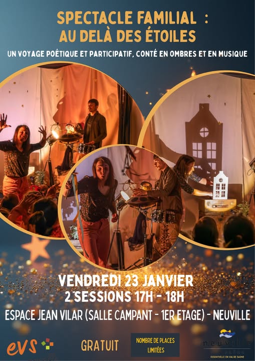 Entre théâtre d’ombre, objets bricolés, chansons et souvenirs partagés, ce spectacle musical et interactif invite petits et grands à écouter, rêver, et créer. On découvre alors que la musique peut faire surgir des souvenirs, éveiller l’imaginaire et devenir alors le plus beau vaisseau pour rejoindre ceux qu’on aime. Et qu’il suffit parfois de tendre l’oreille et de fermer les yeux pour laisser son imagination s’envoler… Au-Delà des Étoiles.
