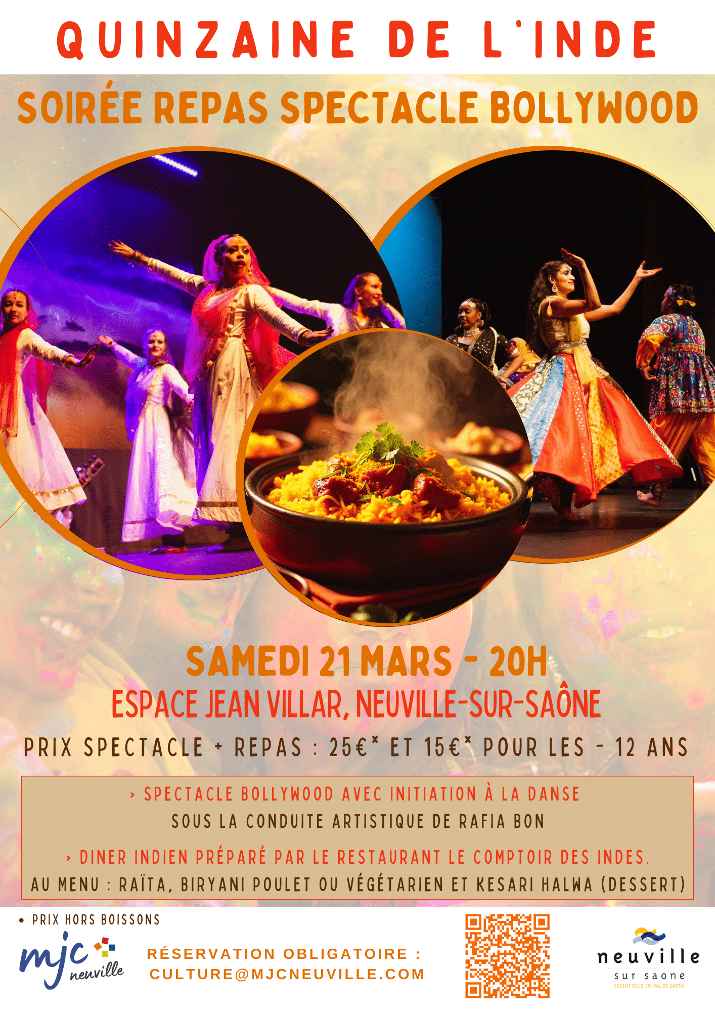 Plongez au cœur de l’Inde le samedi 21 mars 2026 pour une soirée festive repas et spectacle Bollywood à l’Espace Jean Vilar à Neuville-sur-Saône. À l’occasion de la Quinzaine de l’Inde, laissez-vous emporter par une programmation haute en couleurs mêlant danse, musique et gastronomie indienne.